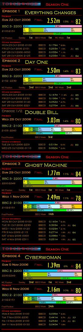 Har plågat mig med Torchwood från det första avsnitten till "Out of time" (avsnitt 10), varefter jag åkte hem till Sverige för julen, och jag har aldrig varit så besviken på en serie i hela mitt liv (möjligtvis en överdrift eftersom jag sett väldigt mycket skräp). Trodde att man skulle fokusera på Jack eftersom han användes som dragplåster men i de avsnitten jag sett (jag vet att det finns ett som handlar mer om honom, man jag har inte sett det än) så har han reducerats till någon mystisk karaktär i bakgrunden som leder dem med järnhand i slutet av avsnitt som "Greeks bearing gifts" och "Cyberwoman".