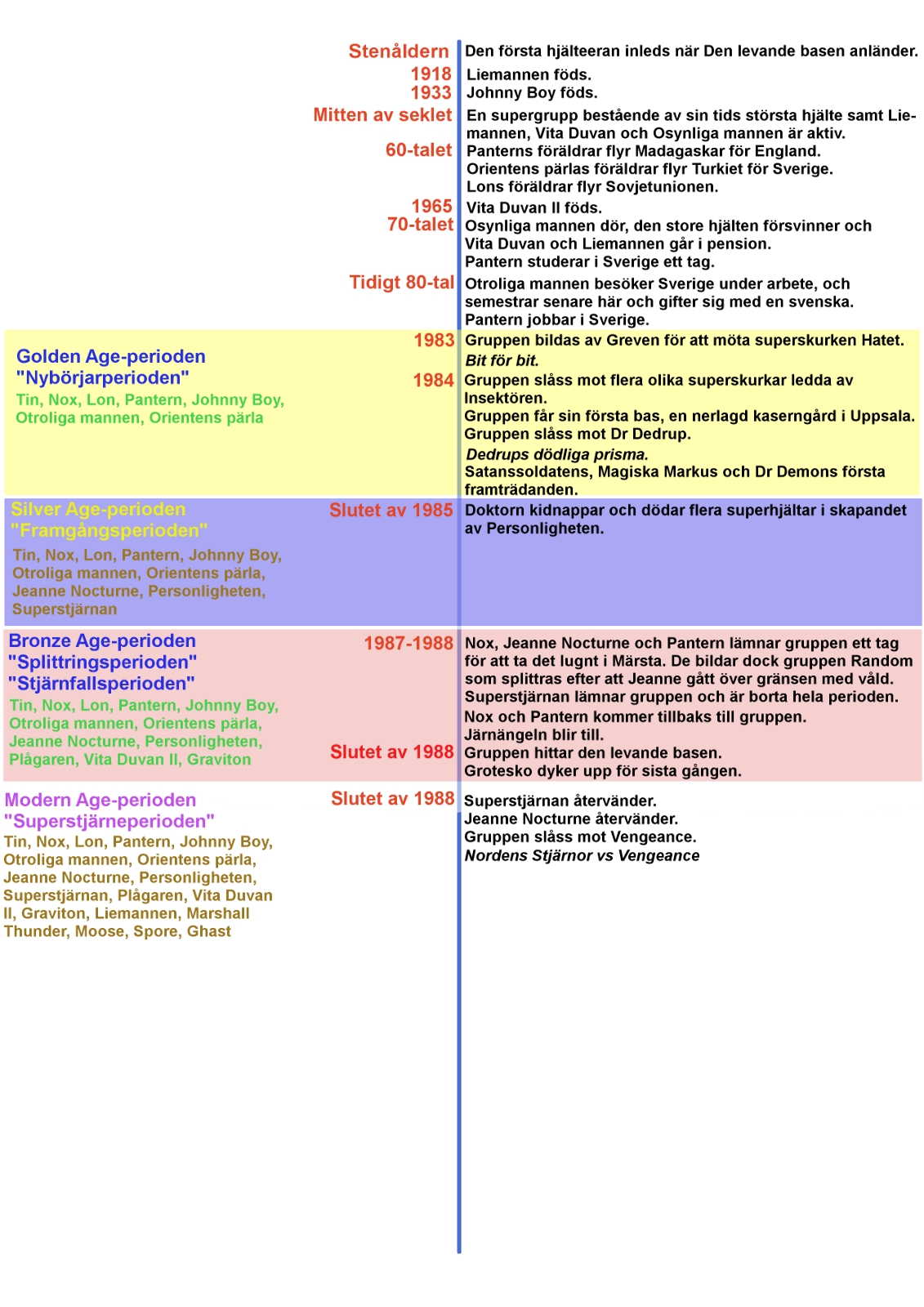 Är det nu meningen att vi ska fylla i med både text och bild där det saknas? Vi måste ju få lite tid på oss. Jag ritar gärna Hatet och Leif Schwartz, samt Justice Avengers och dess medlemmar (Hyperman, The Bat med flera). Lägg även till äventyret "Smugglarna" vars manus jag påbörjat.